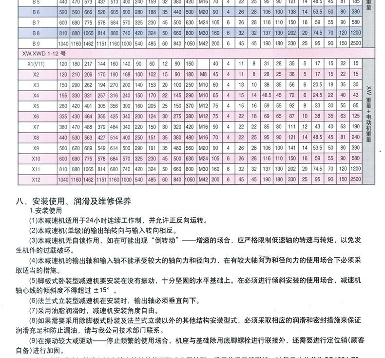 注:以上各形式的減速機,其實質是一樣的,只是各擺線減速機廠家自己推出的型號,標識方式不同而已) X B系列行星擺線針輪減速機基本型號及速比 單級擺線(XW.XWY.XWD,XL.XLY,XLD) 機型號有:X0、X1、X2、X3、X4、X5、X6、X7、X8、X9、X10、X11、X12 傳動比:9、11、17、23、29、35、43、59、71、87 雙級擺線(XWE.XWEY.XWED,XLE.XLEY,XLED) 機型號有:X20、X31、X42、X53、X63、X74、X84、X95、X106、X117 傳動比:121(11×11)、187(17×11)、253(23×11) 、289(17×17)、385(35×11) 、 391(23×17)、473(43×11)、493(29×17)、595(35×17)、 731(43×17)、841(29×29) 單級擺線(BW.BWY.BWD,BL.BLY,BLD) 機型號有:12、15、18、22、27、33、39、45、55、65 傳動比:9、11、17、23、29、35、43、59、71、87 雙級擺線(BWE.BWEY.BWED,BLE.BLEY,BLED) 機型號有:1510、1512、1812、1815、2212、2215、2218、2715、 2718、3318、3322、3922、4527、5527、5533、6533 傳動比:121(11×11)、187(17×11)、253(23×11) 、289(17×17)、385(35×11) 、 391(23×17)、473(43×11)、493(29×17)、595(35×17)、 731(43×17)、841(29×29) X B系列行星擺線針輪減速機扭矩計算 擺線針輪減速機扭矩=9550×電機功率÷電機功率輸入轉數×速比×使用效率(65%-75% BWD擺線針輪減速機