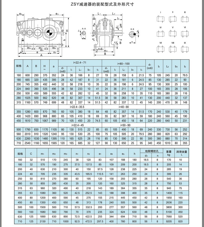 ZSY圓柱齒輪減速機是三級齒輪減速機,它是平行軸減速器,此類減速機中心距,公稱傳動比等主要參數(shù)均經(jīng)優(yōu)化設計,主要零、部件互換性好,齒輪均采用優(yōu)質(zhì)合金鋼經(jīng)滲碳、淬火而成,齒面硬度達54-62HRC,該產(chǎn)品體積小,重量輕,精度高,噪音低,一般采用油池潤滑,自然冷卻,工作環(huán)境溫度為-40+50度,如果低于0度,啟動前潤滑油應預熱至0度以上,本減速器可用于正反兩個方向運轉(zhuǎn)。ZSY圓柱齒輪減速機有22.4,25,28,31.5,35.5,40,45,50,56,63,71,80,90,100十四種傳動比,九種安裝方式 SY減速機產(chǎn)品是按標準JB/T8853-2001生產(chǎn)的外嚙合漸開線斜齒圓柱齒輪減速機。